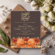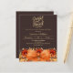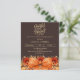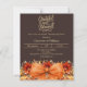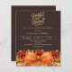 Eine bistre, dunkelbraune Hintergrundfarbe. Dekoriert eine große orangefarbene Bug und Fall Blume. Personalisieren Sie die Party-Details und fügen Sie sie hinzu. Text-Skript: Dankbar und gesegnet. 1 Blatt = 1 Einladung mit Druckkante bis Kante.