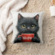 Ein flauschiges schwarzes Kätzchen mit großen grünen Augen hat eine hellrote Tasse mit dem Titel "Nope"