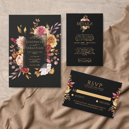 Black Floral Floral Fall Boho Hochzeitsdetails Begleitkarte (Personalisiere diese Kollektion eines unabhängigen Creators.)Black Floral Floral Fall Boho Hochzeitsdetails Begleitkarte (Vorderseite)Black Floral Floral Fall Boho Hochzeitsdetails Begleitkarte (Rückseite)