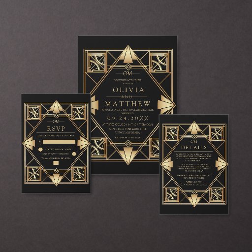 Black & Gold Modern Art Deco Wedding Invitation Einladung