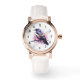 Eine Uhr mit einem Bild einer schwarzen Krähe mit lila rosa Flügeln. Ein rosa Aquarell-Spritzer hinter diesem mystischen Vogel.