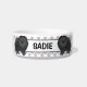 Desteis originelle Cartoon-Illustration eines niedlichen schwarzen Fell Farbe Spitz züchten Hund. Es gibt auch einen personalisierbaren Textbereich für einen Namen. Der Hintergrund weist ein Muster grauer Hundepfoten auf.