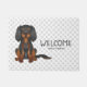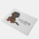 Desteis originelle Cartoon-Illustration einer niedlichen Schwarz-Bein-Farbe Cavalier König Charles Spaniel züchten Hund, der sitzt. Es gibt auch Text, der nun "Willkommen" zusammen mit einem personalisierbaren Textbereich für einen Familiennamen oder anderen benutzerdefinierten Text liest. Der Hintergrund weist ein Muster grauer Pfotendrucke auf.