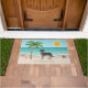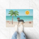 Desteis originelle Cartoon-Illustration einer niedlichen Schwarz-Bein-Fell-Farbe Rottweiler Rasse Hund stehend in einer tropischen Sommer Strand-Szene. Der beige Sand ist mit einer Palme, einer rosa Muschel, einem Seestern und einer roten Krabbe verziert. Das Wasser ist türkisblau mit einigen Wellen und die Sonne scheint über dem Horizont. Es gibt auch einen personalisierbaren Textbereich für einen Familiennamen oder anderen benutzerdefinierten Text wie "Willkommen". Der Text wird auf dem Grund so platziert, dass er so aussieht, als wäre er auf dem Sand geschrieben.
