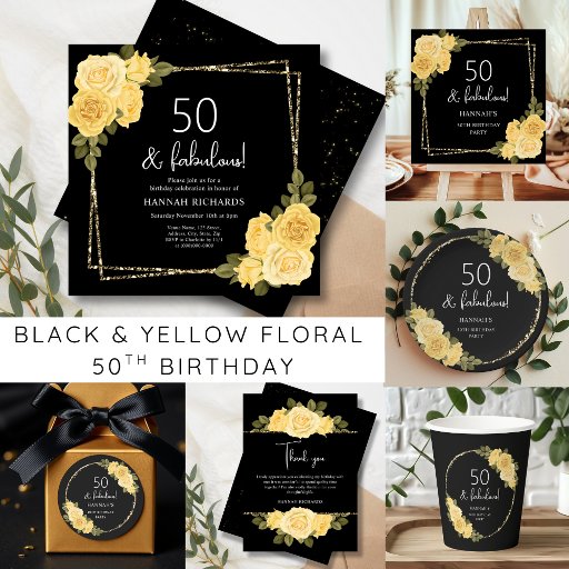 Black Yellow & Gold Floral 50. Geburtstag Einladung