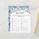 Ein Blatt Papier mit dem Spiel "Baby Item ABC" für eine Babydusche, dekoriert mit bezaubernden Aquarellbildern von Pflanze mit weichen pastellfarbenen smaragdgrünen und blauen Blätter, Ästen und weichen rosa Rosen.