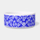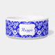 Weiße Keramik Hundefutter / Wasserschüssel, mit einem blauen und weißen, blühenden Damast-Muster, um die Außenseite. Ein weißer Textbereich auf der Vorderseite der Schüssel hat einen blauen, benutzerdefinierten Text, der auf Ihre Bedürfnisse zugeschnitten werden kann. Es stehen passende Heimtierprodukte zur Verfügung.