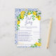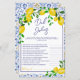 Mit unserem inspiriert-mediterranen Quiz-Spiel, das sich durch die zauberhaften blauen Keramiken-Fliesen und das fröhliche, handbemalte, gelb-grüne Aquarelllemonen-Design auszeichnet, können Sie Ihre Babydusche mit einem zusätzlichen Spaß versehen. Diese frische und moderne, geschlechtsneutrale Spieleinladung beeindruckt Ihre Gäste mit ihrer trendigen Bogenform und dem eleganten Pinselskript. Machen Sie sich bereit, Ihre Gäste mit dieser einzigartigen und stilvollen Ergänzung zu Ihrer Babydusche-Feier zu unterhalten und einzubinden!