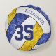 Dieses lustige Volleyballkissen für Mädchen mit individuellen Teamfarben zeigt das realistische, stylisierte Bild eines blauen, goldenen und weißen Volleyballs, das ein künstlerisches, blumenkalidoskopisches Muster mit seinen blauen und goldenen Paneelen - personalisiert mit ihrem Namen und ihrer Jersey-Nummer - von katz_d_zynes hat
