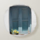 BLAUE HOLZTÜR AUF DER WEISSEN KONKRETEN WAND RUNDES KISSEN
