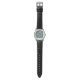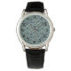 Die Armbanduhr hat eine geometrische Form von Kreisen in Reihen mit Kreisen oder Ovalen in blau auf einem grünen Feld.