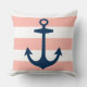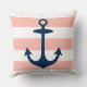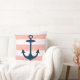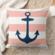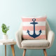 Das stilvolle und schicke Kissendesign mit quadratischem Akzent besticht durch ein breites Muster weißer Cabana-Streifen an der Küste mit einem marineblauen Anker. Die Farbe rot / hellkorallenrosa im Hintergrund kann angepasst werden.