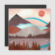 Berglandschaft in Rot und Blues mit einem See und einem kühnen blauen Regenbogen.