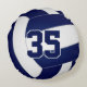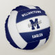 Dieses Team Farben Volleyball rund werfen Kissen zeigt das realistische Bild eines Volleyballs, der marineblau und weiß mit Paneelen versehen ist, auf denen man den Namen, Monogramm oder Variatitätsbuchstaben, Mannschafts- und Maskottnamen auf der Vorderseite und Trikotnummer auf der Rückseite - durch katz_d_zynes