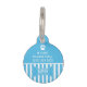 Ein Identifikations-Umbau für Hunde in der blauen Farbe, einen Knochen mit dem Hundenamen und einen Tatzendruck mit Kontaktdetails für den Eigentümer zeigend.