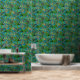 Die Vintage Tapete mit türkisblauen Wänden besticht durch eine üppige tropische Dschungelszene mit eleganten Palmen und Bananenbäumen, die mit lebhaften Blume und breiten Bananenprogrammen verwoben sind. Majestätische Pfauen und exotische Vögel fügen dem Muster, ihren Federn und Farben eine Touch von echter Eleganz hinzu, die das dichte Blätter wunderbar ergänzen. Das aufwändige Design und die Details schaffen eine faszinierende und opulente Atmosphäre. Diese Tapete wäre ideal für ein luxuriöses Wohnzimmer, einen stilvollen Speisesaal oder eine gehobene Boutique, die den Raum mit einem Gefühl von Grandeur und tropischer Eleganz bereichern würde.