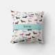 Niedliches Kissen für jedermann das Liebe-Dackeln. Dieses Kissen hat Hunderte von den bunten kleinen Dackelhunden ganz über ihm. Eine Grafik eines blauen Bandes läuft durch die Mitte. Sie fertigen den Namen in der Mitte besonders an. Sehr niedlich.