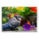 Diese bunte Anmerkungskarte kennzeichnet ein blaues Jay, das auf einer Portalplattform gelandet ist, die durch Blumen umgeben wird. Die blaue, graue, weiße und schwarze Färbung des Vogels wird durch einen Aufstand der Farbe ausgelöst. Es gibt eine dekorative Teekanne mit den orange und gelben Kapuzinerkäsen und einer lila Petunie. Grün-Blätter schließt dieses Kaleidoskop von Farben ab.