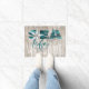 Willkommen in Ihrem Strandhaus oder Ihrer Hütte mit dieser modernen nautischen und aquamarin blauen Typografie-Doormat an der Küste, die eine große Schrift für das Leben auf dem Meer und moderne, handgezeichnet Seesterne und Korallenriffe auf einem naturbelassenen Stallholzhintergrund bietet.