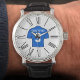 Blaues Shirt mit römischen Zahlen. Armbanduhr