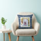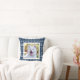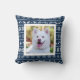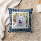 Blaues und weißes Feiertags-Wurfskissen mit einem Muster der Schneeflocken, der Herzen und der Elche in weißem und in dunkelblauem. Fügen Sie ein Foto Ihres Haustieres hinzu!