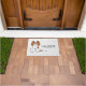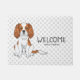 Desteis originelle Cartoon-Illustration einer niedlichen blenheimer Farbe Cavalier König Charles Spaniel züchten Hund, der sitzt. Es gibt auch Text, der nun "Willkommen" zusammen mit einem personalisierbaren Textbereich für einen Familiennamen oder anderen benutzerdefinierten Text liest. Der Hintergrund weist ein Muster grauer Pfotendrucke auf.