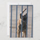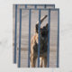 Wachhund bellt hinter blauen Eisenstangen. Fotografie.