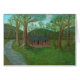 Pastellmalerei eines Blockhauses nahe bei einem Strom. Die Kabine wird durch Bäume mit Bergen im Hintergrund umgeben.