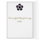 Ich schuf ein Fraktal-Kunstdesign und schnitt dann eine Blume aus. Das Übersetzen der verschiedenen Größen der Blume auf einem grünen, stammähnlichen Design schuf einen einzigartigen Blumenstrauß. Das Hinzufügen einer Danksagung für Ihre Mutter macht dies zu einer guten Wahl für eine Muttertagskarte, eine Geburtstagskarte, eine Dankescharte oder einen anderen Anlass, wenn Sie gewollt haben, Ihrer Mutter zu zeigen, dass Sie froh sind, dass sie Ihre Mutter ist. Die erste Meldung auf der Karte lautet "Feiern Sie die beste Mutter für mich." In der Karte steht die Nachricht "Ich bin so froh, dass deine Mutter." Die Farben der Blume und der Karte sind blau und goldfarben.