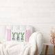 This Easter pillow features cute bunny rabbit green topiaries with pink, blue and yellow bows in blue and white chinoiserie flowerpots.