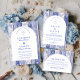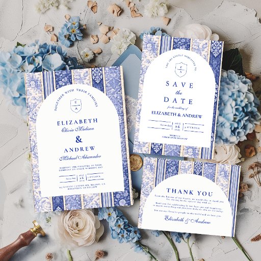A timeless blue and white design inspired by classic Delft porcelain and French toile patterns. The patchwork tile border combines delicate florals, stripes, and ornamental motifs that evoke vintage European ceramics. A soft arched panel in the center keeps the layout refined and elegant while allowing the details of the porcelain-inspired pattern to frame the celebration beautifully. Perfect for couples planning a sophisticated blue and white wedding with traditional European charm.