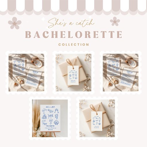 Celebrate the bride-to-be with this playful “Shes a Catch” bachelorette invitation, featuring coastal doodles, a chic wavy frame, and a bold blue bow. From cocktail glasses to seashells and bikinis, this design brings major tropical vibes — perfect for a beach bachelorette weekend, poolside party, or nautical girls’ getaway. Fully editable for your custom details!