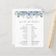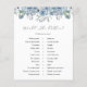 Brautparty Spielkarte mit einer Aquarellkaskade mit blauen Blumen. Eine unterhaltsame Art, mit Duschgästen zu interagieren.