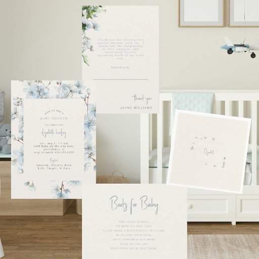 Blue Floral Cream Baby Dusche Einladung