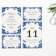 This Blue Floral Elegant Fiesta Spanish Wedding RSVP Card design features delicate blue floral and swirl motifs inspired by traditional Mexican Talavera pottery, arranged elegantly in the corners. The deep blue hues contrast beautifully against the soft, textured white background, creating a clean and refined look. Ideal for wedding invitations or formal event stationery, this design adds a touch of cultural charm and timeless elegance.