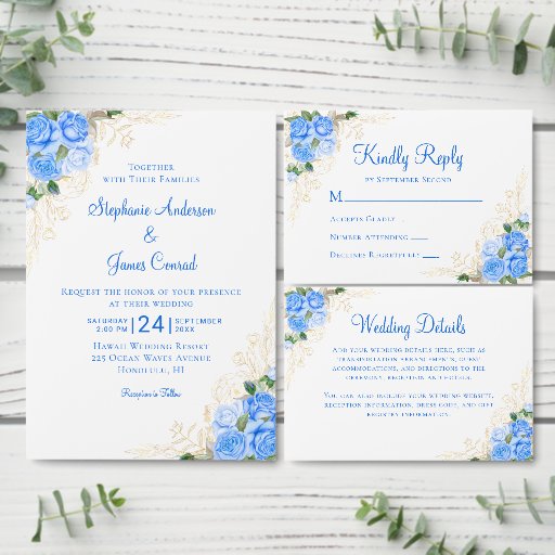 Dieses elegante Blumendesign ist einfach und trendig. Ihre Hochzeitsdetails sind gerahmt mit blauen Aquarellfarben-Rose und goldenen Blumenakzenten. Der Text ist in einer komplementären blauen Farbe. Die Rückseite hat einen Aquarellblau strukturierten Hintergrund.