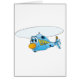 Ein skurriler, blauer Cartoon Hubschrauber fliegt den freundlichen Himmel.