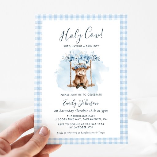 Serve treats and celebrate in style with these adorable Highland Cow baby shower paper plates, perfect for a baby boy shower with a sweet farm inspired theme. Featuring a charming watercolor baby calf on a swing, soft blue florals, and a classic blue gingham border, these disposable party plates bring cozy countryside charm to your baby shower table décor.