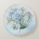 Dieses hübsche, runde Kissen ist mit einem Hydrangeas-Bouquet in hübschen Blautönen gestaltet.
