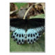 Blauer, irrisierender Mormon Schmetterling auf tiefgrünem Blatt.