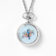 Ein blauer Jay-Vogel umgeben von rosa, lila und pfirsichfarbenen Frühlingsblumen Set vor einem hellblauen Hintergrund.