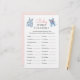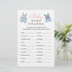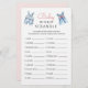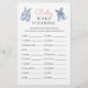 Fordern Sie die Gäste mit dieser Baby Shower Word Scramble Spielkarte an. Dieses Spiel mit einer niedlichen Aquarelltüte mit Denim- und Rosa-Baby-Kleidung lädt die Gäste dazu ein, Wörter aus dem Babybereich zu entwirren. Der Erste, der fertig ist, gewinnt einen Preis! Eine unterhaltsame und klassische Aktivität, die perfekt zu Ihrem denim blauen Junior Baby Dusche Thema passt. Dieses Spiel umfasst die folgenden Begriffe zu entwirren: 1. Milch, 2. Decke, 3. Schaukelstuhl, 4. Rüstung, 5. Windeln, 6. Dusche, 7. Schnuller, 8. Gummiente, 9. Rattle, 10. Bib, 11. Storch, 12. Roller, 13. Kinderzimmer, 14. Spielzeug, 15. Hochstuhl, 1 6. Kindersitz, 17. Formel, 18. Karosserieanzug, 19. Baby, 20. Flasche