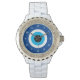 Blue Mati Evil Eye Symbol weiße Email-Uhr für Frauen. Blaublau griechischen / türkischen Ikone für Schutz und viel Glück. Damenuhr. Optional mit Text personalisieren.