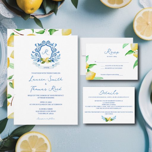 Blue Mediterranean Watercolor Lemon Wedding Serviette