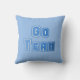 Das Kissen ist in Weiß gehalten, mit blauen Streifen auf der Oberseite und am Boden des Kissens. Grafik eines blauen Megaphons, mit schwarzem Skripttext rund um das Megaphon, mit dem Credo der Cheerleader. Die Rückseite des Kissens ist massiv blau, der blaue grafische Text liest GO TEAM. Eine tolle Geschenkidee für jeden Altersjubelleiter.