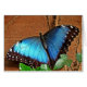 Ein naher Blick nach oben auf einen blauen Morpho-Schmetterling mit schimmernden blauen Flügeln an der Holzdecke, im Magic Wings Butterfly Conservatory in Massachusetts.