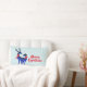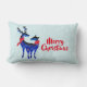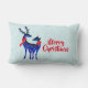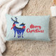 Ein Lumbalkissen mit dem Text: Frohe Weihnachten. Text kann leicht bearbeitet werden, um zu sagen, was Ihnen gefällt. Mit einem hellgrün-weiß schneebedeckten Hintergrund. Illustriert mit einem blauen skandinavischen Hirsch mit roten Schals. Mit dekorativen Markierungen auf ihren Körpern.