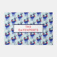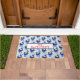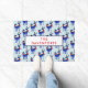 Personalisierte Türmatte mit einem Weihnachtsmuster. Mit einem hellgrünlich blauen Hintergrund. Illustriert mit einem blauen skandinavischen Hirsch mit roten Schals. Dekorative Markierungen auf ihren Körpern.