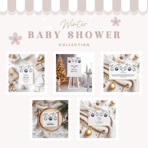 Dieses elegante Baby-Duschdesign besticht durch ein Trio von handbemalten blauen Weihnachtsschmuck, das von Wein und Kiefernästen hängt. Mit zarten Schneeflocken und botanischen Motiven in sanften Aquarellfarben ist dieses Winterthema perfekt, um einen kleinen Jungen in der gemütlichen Urlaubssaison zu feiern.