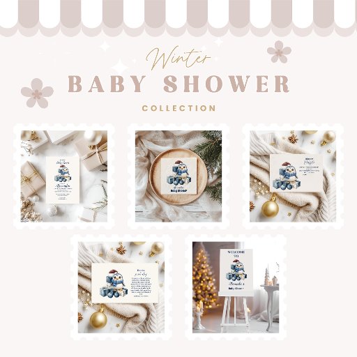 Freuen Sie sich auf eine gemütliche Winterdusche mit einem handbemalten Pinguin in einer Weihnachtsmannmütze und einem Schal, umgeben von gestapelten Geschenkboxen und festlich blauen Ornamenten. Der sanfte Aquarellstil und die coolen Farbtöne sorgen für ein spielerisches und gemütliches Ambiente - ideal, um einen kleinen Jungen während der Ferienzeit zu empfangen.